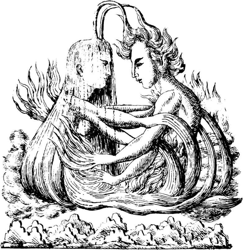 無意識體驗是一種個人秘密,只能和極少數人進行溝通交流,而且即使嘗試進行溝通也相當困難;由此而產生上述隔離效果。但是,隔離就會引起對心理氣氛的補償性激發,使我們對這種神秘離奇的東西感到震驚。在夢中出現的那些人物是女性,因而指的是無意識中的女性性質。她們是仙女、迷人的塞壬或拉彌亞(圖10、圖11、圖12;也請參見圖157),她們使孤獨的徘徊者被衝昏了頭腦,最終誤入歧途。同樣,在波利菲爾(Poliphile)[13]的《尼克亞》[14]中一開始出現的是一個很誘人的少女(圖33),而帕拉賽爾蘇斯的梅露西娜[15]則是另一個類似的角色。