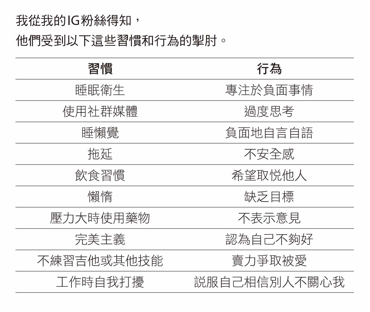 這些習慣或行為有多少是你想要改變的?幸運的是,這些特徵都不是你與生俱來的,不是你核心人格個性的一部分。它們全都是可塑的,是可以改變的。你不需要一直負面地自言自語,也不需要懶惰和過度思考你的完美主義。我向你保證,讀完本書後,你將知道如何解構生活中的許多方面,並且能夠將這些知識應用於任何情景,從而實現持久的改變。