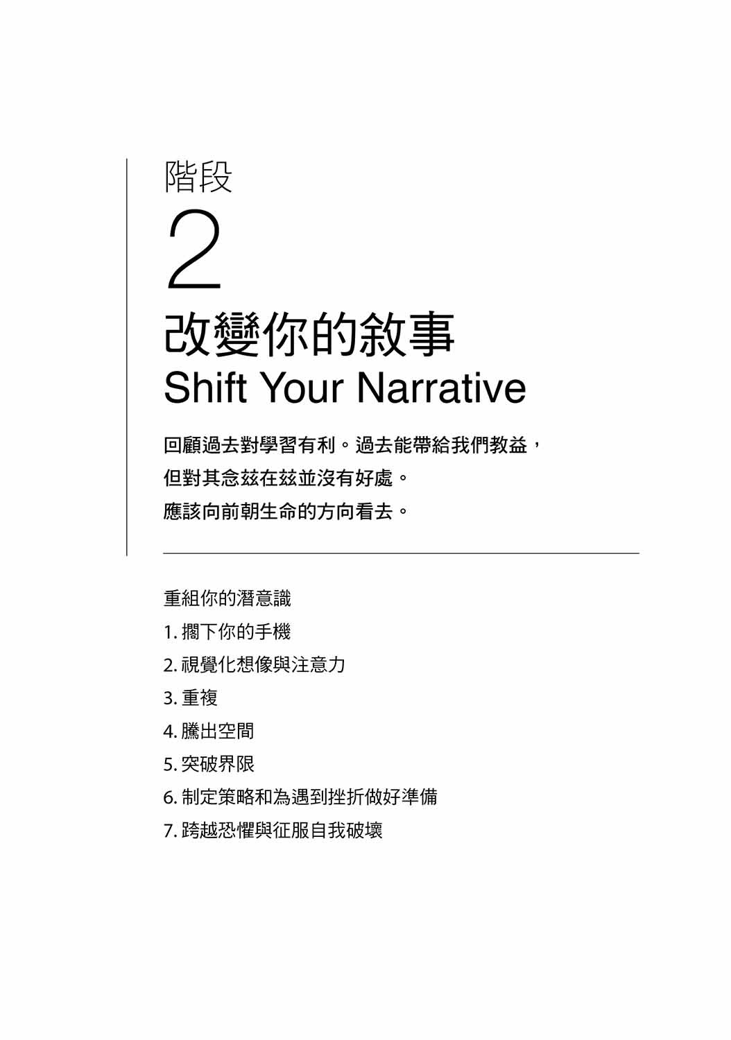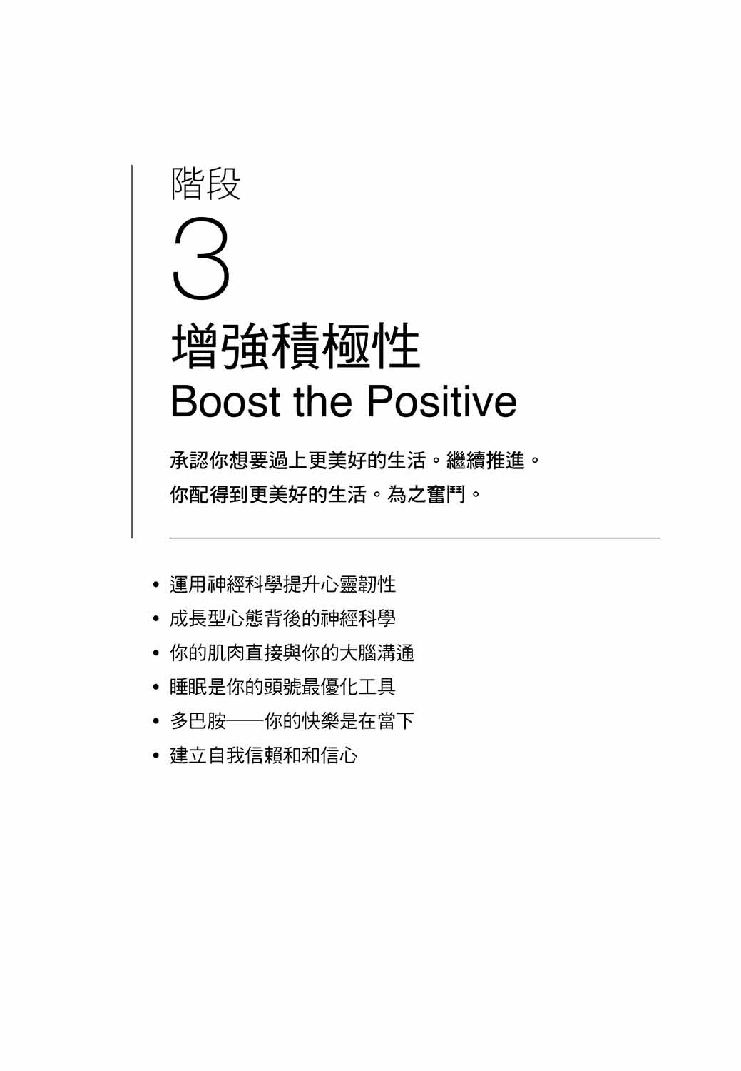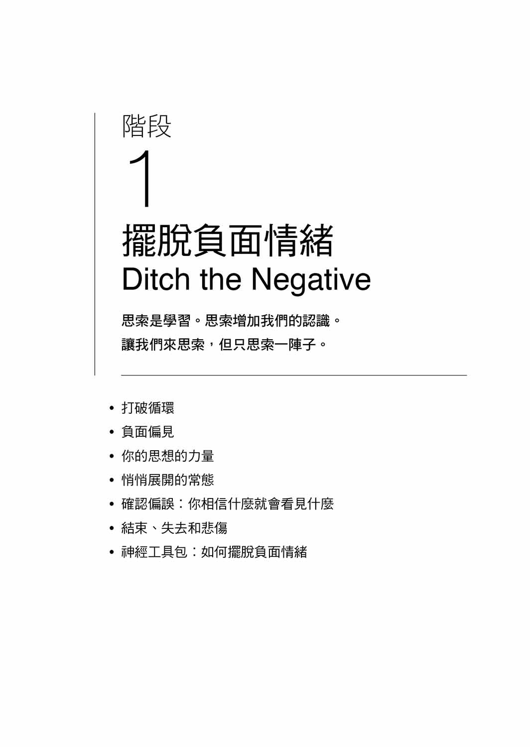 本書將透過三階段幫助你打破循環、改變思想和創造持久的改變。在「階段1」(稱為「擺脫負面情緒」),我們將探討如何甩掉任何對你構成掣肘的事情。它將幫助你瞭解,壓力(無論好壓力還是壞壓力)是如何調節你的中樞神經系統。這正是我們大腦運作的精要所在,懂了它,你就可以為進行改變奠定基礎。你將瞭解到我們的大腦為什麼喜歡專注於負面事情,以及如何改變這種狀況。在「階段2」(稱為「改變你的敘事」),你將要真正投入努力去改變你的大腦硬體,透過7個步驟重組你的潛意識。你將學習到如何改善你的敘事。在「階段3」(稱為「增強積極性」),你將學會如何支援你的硬體,以獲得持久的改變。這個最後階段將幫助你瞭解如何達到幸福的最高水平,並日復一日地保持住這水平。