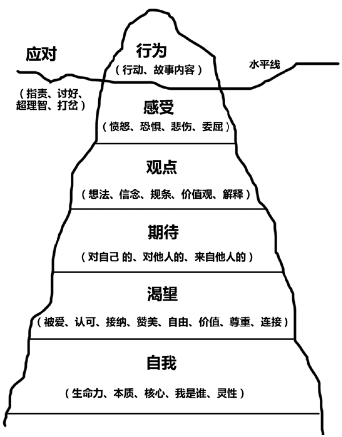 個人內在系統。 我們在得到別人的反應後,需要經過個人內在系統的加工,才能決定感受到怎樣的愛。內在系統是個體自身所有組成部分的關係。人們在面對外在世界的時候,會啟動內在所有的部分去應對,包括個人的行為、感受、觀點、期待與渴望,薩提亞用“內在冰山”隱喻這個過程,我們所見的行為是水面之上的內容,而隱藏在水面之下的是個人龐大複雜的內在系統。要解決問題,只是針對行為改正其效果是微乎其微的,這時候需要回到個人的內在系統去解決。個人內在系統是自我價值的反應方式。