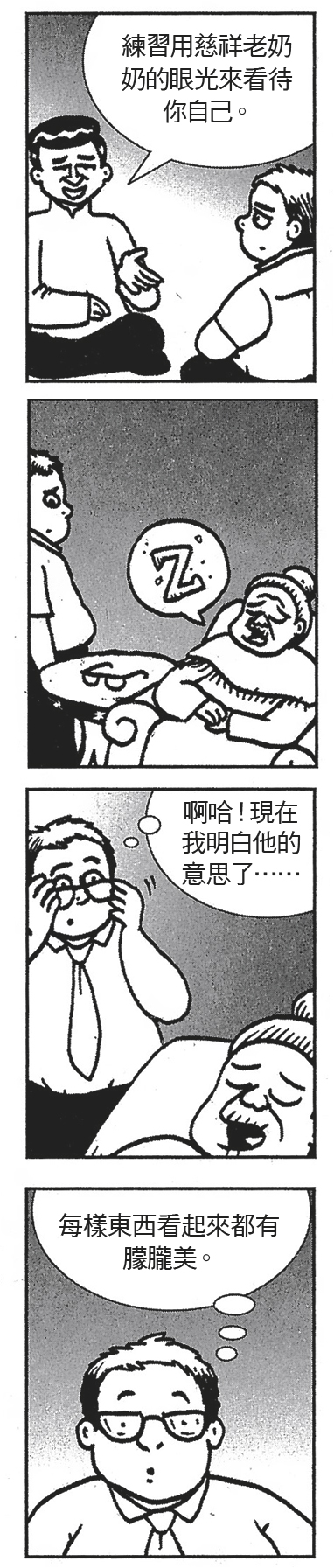 艾倫這位智慧大師,用他一貫平靜、愉悅而低調的態度如是說。但對我而言,他的說明代表了簡單卻又深刻的洞見,足以改變人生。其中的意涵是:快樂不假外求,端看你要不要而已。快樂存乎一心,領悟這點改變了我的人生。