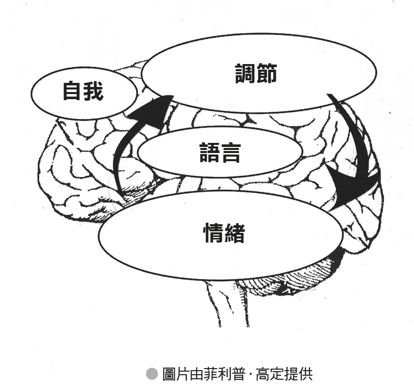 另一組研究來自洛杉磯加州大學馬修.李柏曼(Matthew Lieberman)的研究室。自我調節有種簡單的技巧,稱為「情緒標籤化」,就是用文字來標記情感。當你將正在經歷的情緒轉換成語言(如:「我覺得憤怒」),多多少少會幫助你管理情緒。李柏曼提出了這個過程運作方式背後的神經機制。證據指出,文字標籤能增加右腹前額葉皮質(rVLPFC)的活動,這區通常被稱為大腦的「煞車」,接著會增加大腦執行中樞,也就是內側前額葉皮質(MPFC)的活動,能夠抑制杏仁核。