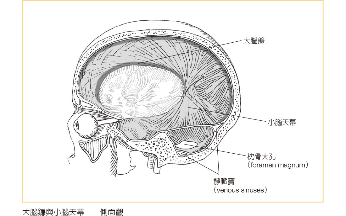 - 放鬆頂骨(parietal bones),可以溫和地釋放頂骨下方大面積的腦脊膜,尤其是大腦鐮(falx cerebri)的緊繃。大腦鐮是一個內翻的組織,位於左右半腦之間,由硬膜所組成,是大腦顱內薄膜系統垂直面的主要構造。
