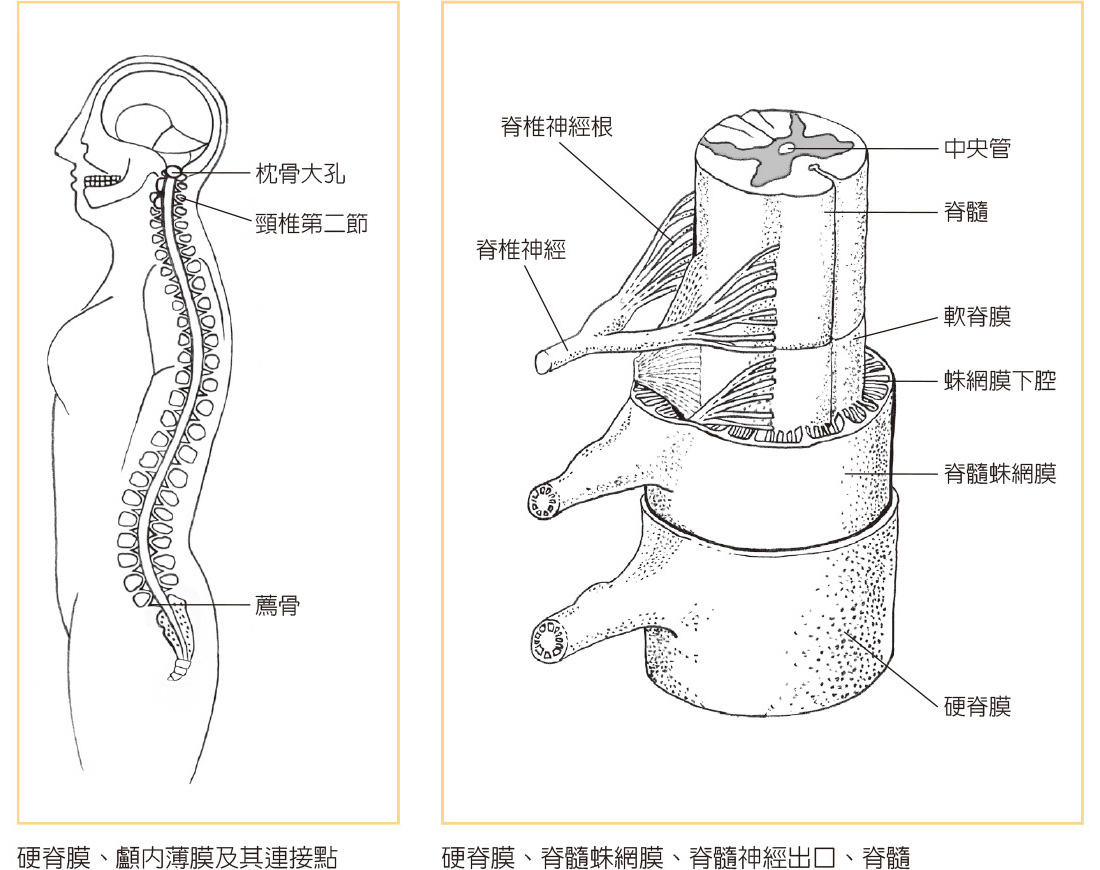 - 裡層:腦脊膜及脊椎神經,它們覆蓋了中樞神經系統。