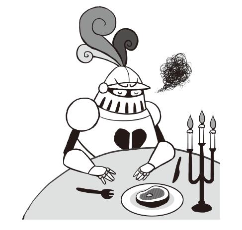 那一天的晚餐讓人尷尬。朱麗葉把弄碎的食物穿過面罩的縫隙一點一點地用叉子餵給騎士吃。朱麗葉越來越氣惱了,每喂一次,朱麗葉的臉色就更難看一些。晚餐吃到一半的時候,騎士告訴了朱麗葉鐵匠幫他弄開盔甲未果的事情。