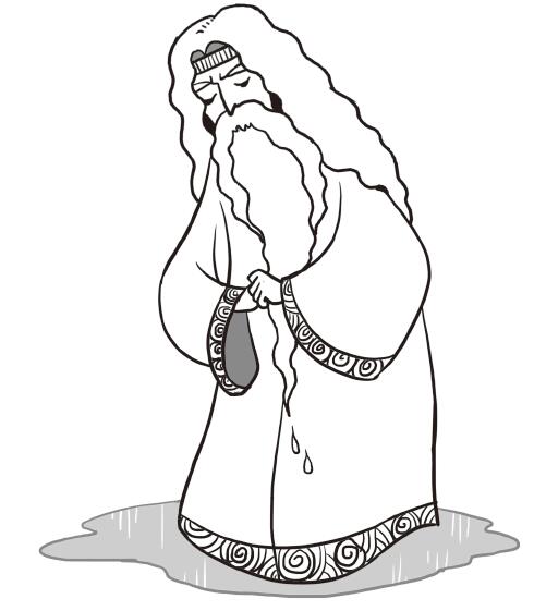 小松鼠和鴿子在一邊看著,騎士雙膝跪地,流下了感激的淚水。騎士心裡想,我差點兒因為憋在心裡的眼淚而送命。眼淚流過騎士的臉頰,沿著騎士的鬍鬚流下,滴在了騎士的胸甲上。這些非同一般的熱淚很快就熔化了騎士身上的盔甲。