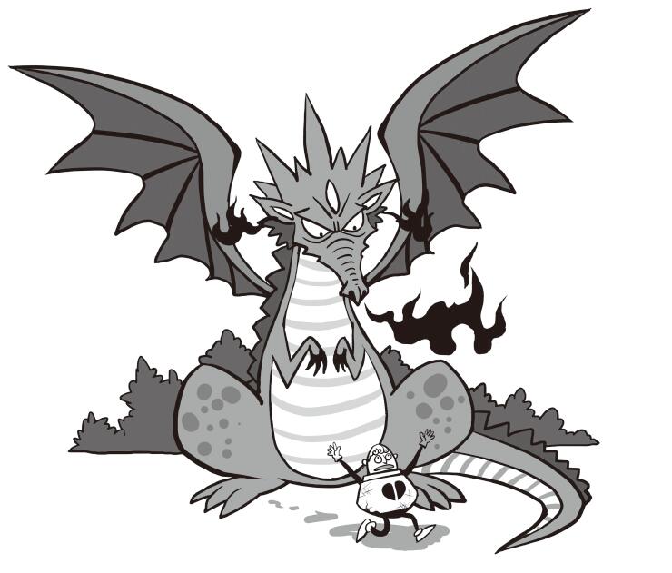 騎士被嚇呆了,僵在原地一動不動。他這一輩子也算見過不少惡龍,但是眼前這一隻惡龍可謂空前絕後、無可匹敵。這個龐然大物不僅可以像通常的惡龍那樣從口中噴出火焰,還可以從耳朵和眼眶中噴出火來,更不妙的是:它噴出的火焰是藍色的。這隻大怪龍的肚子裡一定裝滿了很厲害的燃料。
