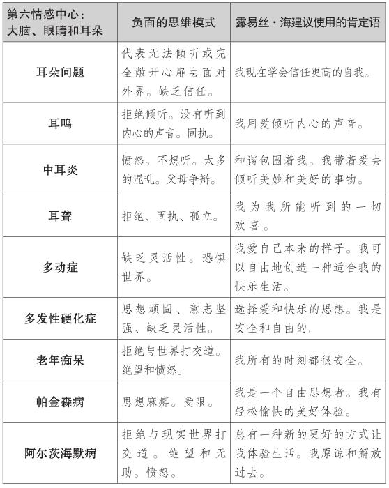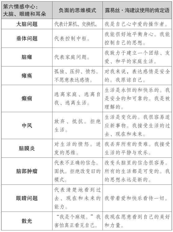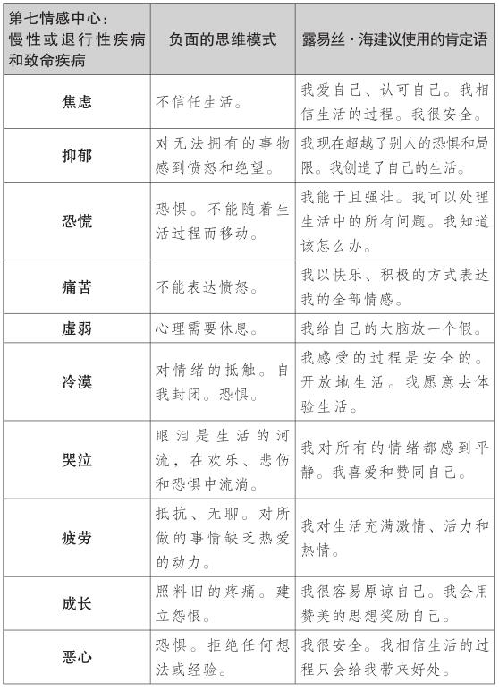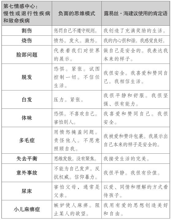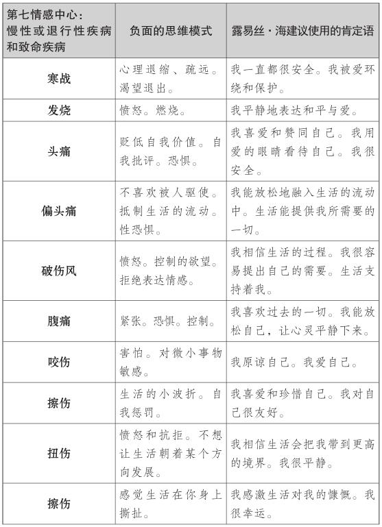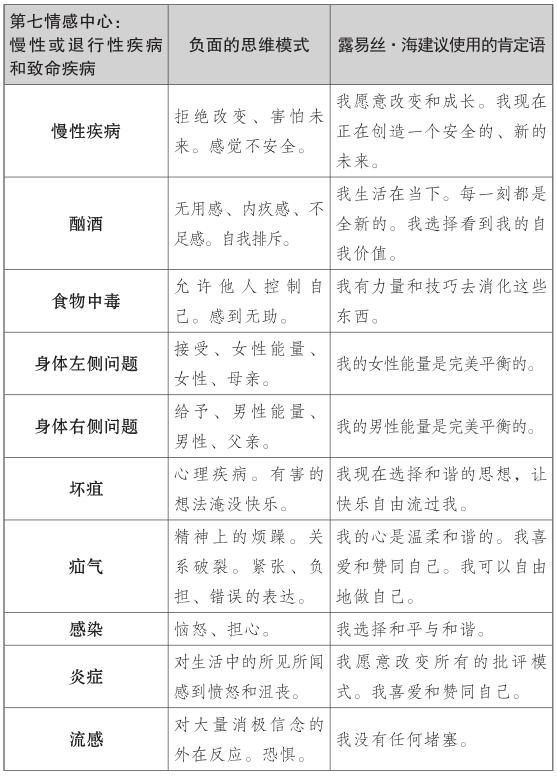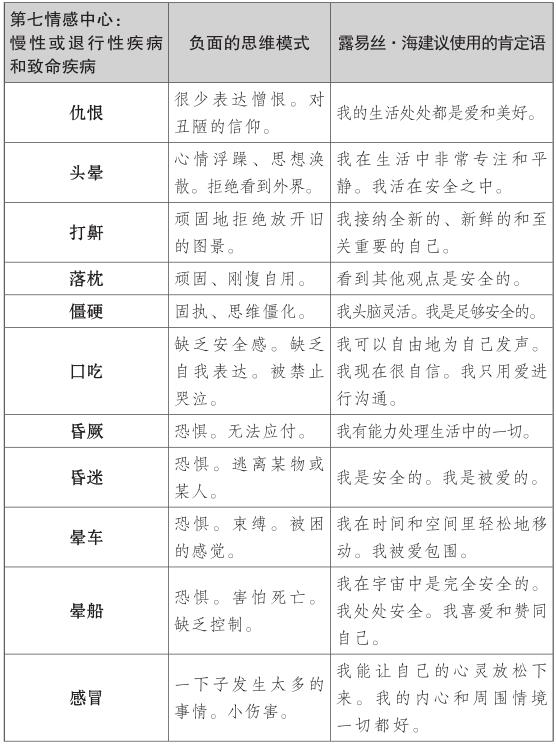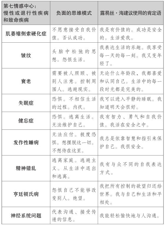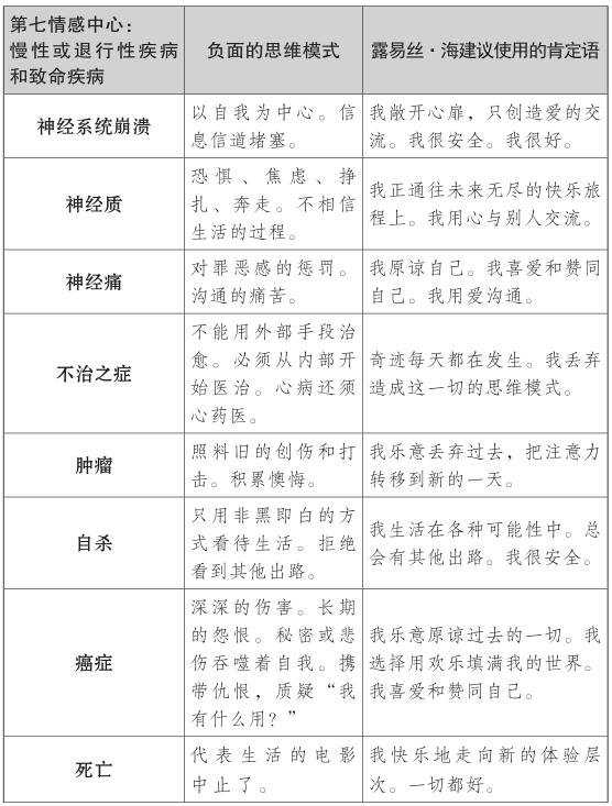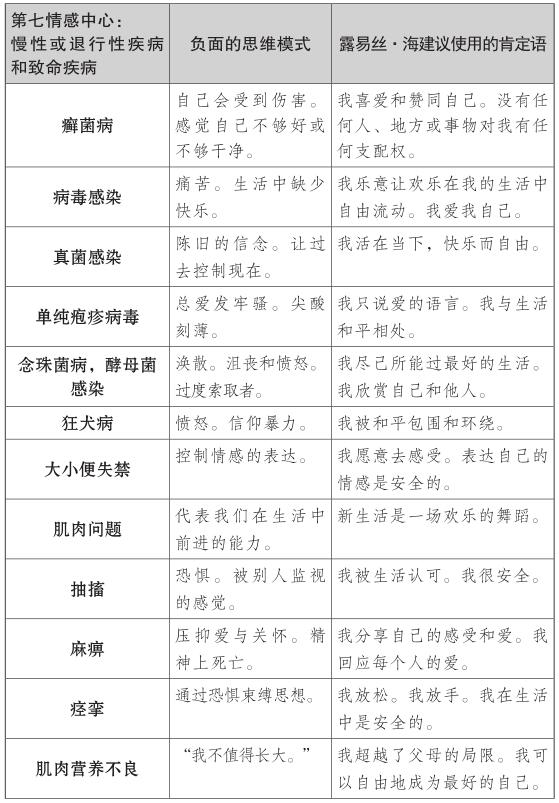 露易絲的肯定理論探索了第七情感中心的慢性和危及生命的疾病背後的情緒,如癌症、肌萎縮側索硬化症(俗稱盧·格里克病)或其他退行性疾病。對露易絲來說,這些疾病是工作、婚姻、生活中的一種停滯的跡象。與癌症和慢性或退行性疾病相關的第七種情感中心的思維模式,常常與否定成功有關,且他們不願相信自己足夠好或有價值。