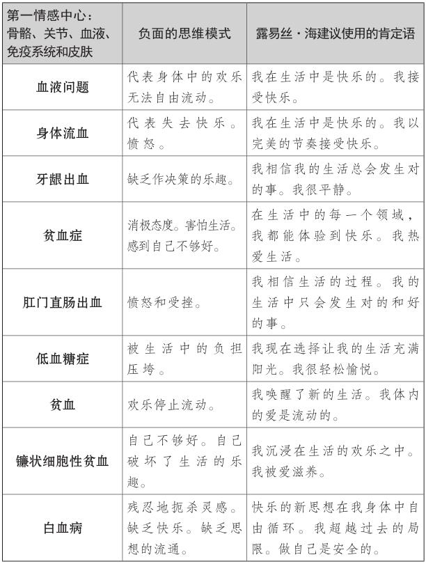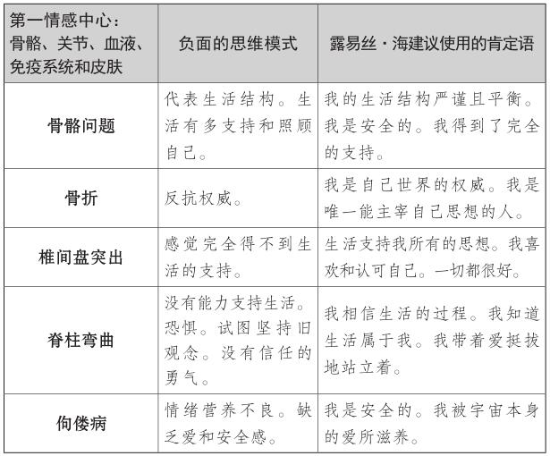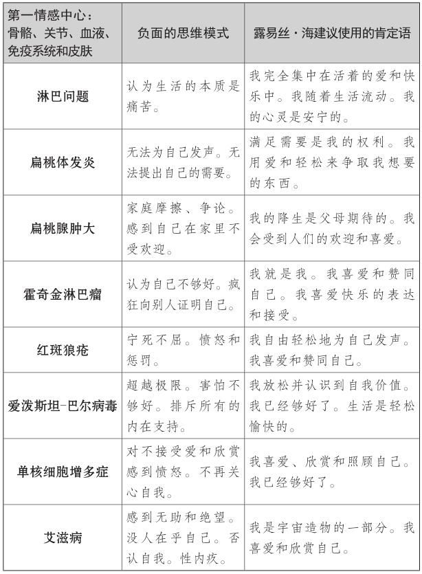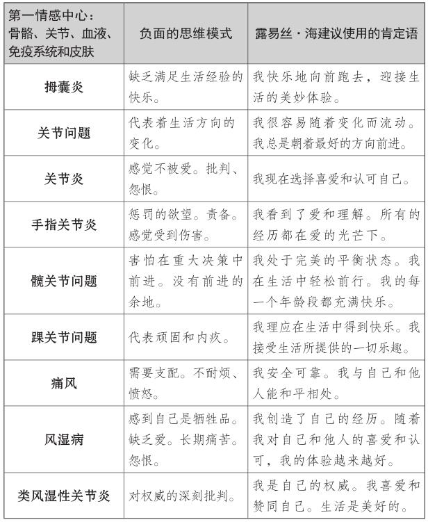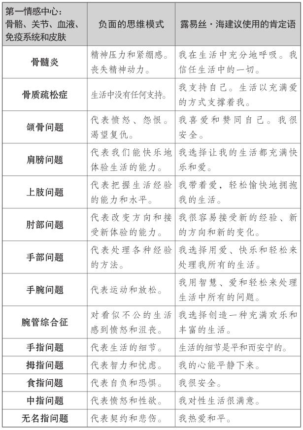 露易絲和我開始討論如何為大家寫一本最有用的書時,我們決定把這些理論構建起來,正如《生命的重建》(You Can Heal Your Life)一書寫的那樣,你們可以看清身體的疾病部位,然後著手處理。但是,你必須記住,人體不是簡單地將各個器官捆綁在一起後的集合,所以人體的某一部位的疾病通常也會影響其他部位的健康。家庭的安全感和可靠感(第一情感中心)也會對自尊(第三情感中心)產生影響。你要想完全被治癒,就必須把生活看作一個整體,同時格外注意導致首要問題的器官或疾病。你可以直接翻閱書查看討論你個人相關問題的某個部分,但是,請你記住,閱讀整本書,你也可以找到自己生活中存在能量不平衡隱患的其他地方。全面瞭解自己的優勢和劣勢,可以幫你為所有情感中心制定健康生活的長期規劃。