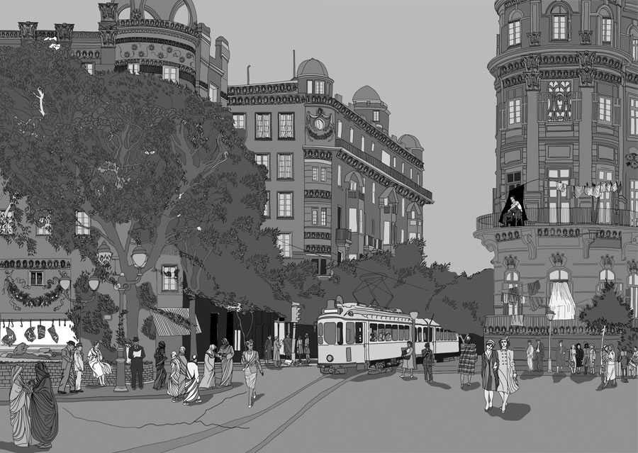 他們消失之後,整條街就漸漸冷清下來。各色節目都登場了吧,我想。只有一些店鋪老闆和幾隻貓留守在街上。天空高懸在路兩側的榕樹上方,純淨,但缺乏光澤。對面的人行道上,菸草店老闆搬了把椅子放在門前,叉開腿坐下,兩條手臂搭在椅背上。剛剛擁擠不堪的電車現在空蕩蕩的。菸草店隔壁,一家叫做「皮埃羅」的小咖啡館裡,服務員正在寂寥的室內清掃著木屑。真是十足的星期天景象啊。