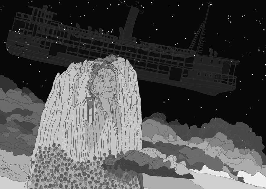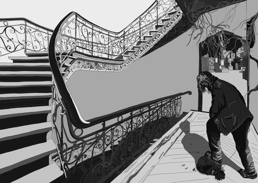 一陣窸窸窣窣的聲響驚醒了我。睜開眼,房間迸發出更亮的白光。沒有一絲陰暗,面前的每一個物件、每一個角度,所有的弧線都浮現出能將人傷害的純淨。就在此刻,媽媽的朋友們都進來了。總共有十來個人,在刺眼的光芒中靜靜挪動的步伐有如滑行。他們全都坐下,椅子卻沒發出絲毫的吱嘎聲。我像是平生第一次仔細地觀察人,他們臉上、衣服上沒有任何細節從我眼前漏掉。然而我聽不到他們的聲響,幾乎難以相信他們是真實存在的。幾乎所有女人都穿著罩衫,用來保持身形的束腰繩則讓她們隆起的腹部更顯眼。此前,我從未注意到老女人的肚子究竟長在哪個位置。男人們幾乎都很枯瘦,都拄著手杖。他們臉上最讓人印象深刻的特徵是看不見他們的眼睛,唯有皺紋形成的凹陷中央隱約透出一絲黯淡的微光。他們就座後,大部分人看著我,侷促地朝我點頭,抑或僅僅是抽搐。我更願意相信他們在致意。此時,我發現他們都圍在看門人身邊,面朝我坐著,微微擺頭。有一陣子我甚至產生了滑稽的想法:他們在審判我。