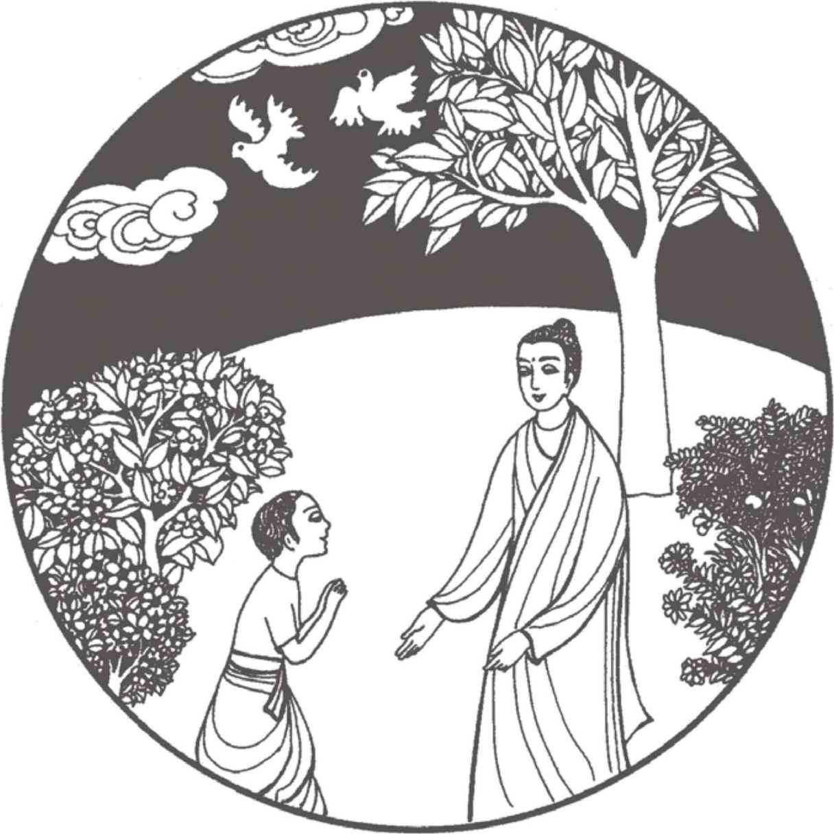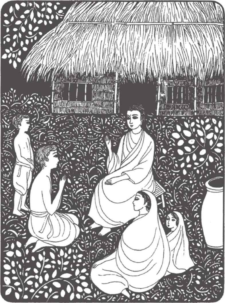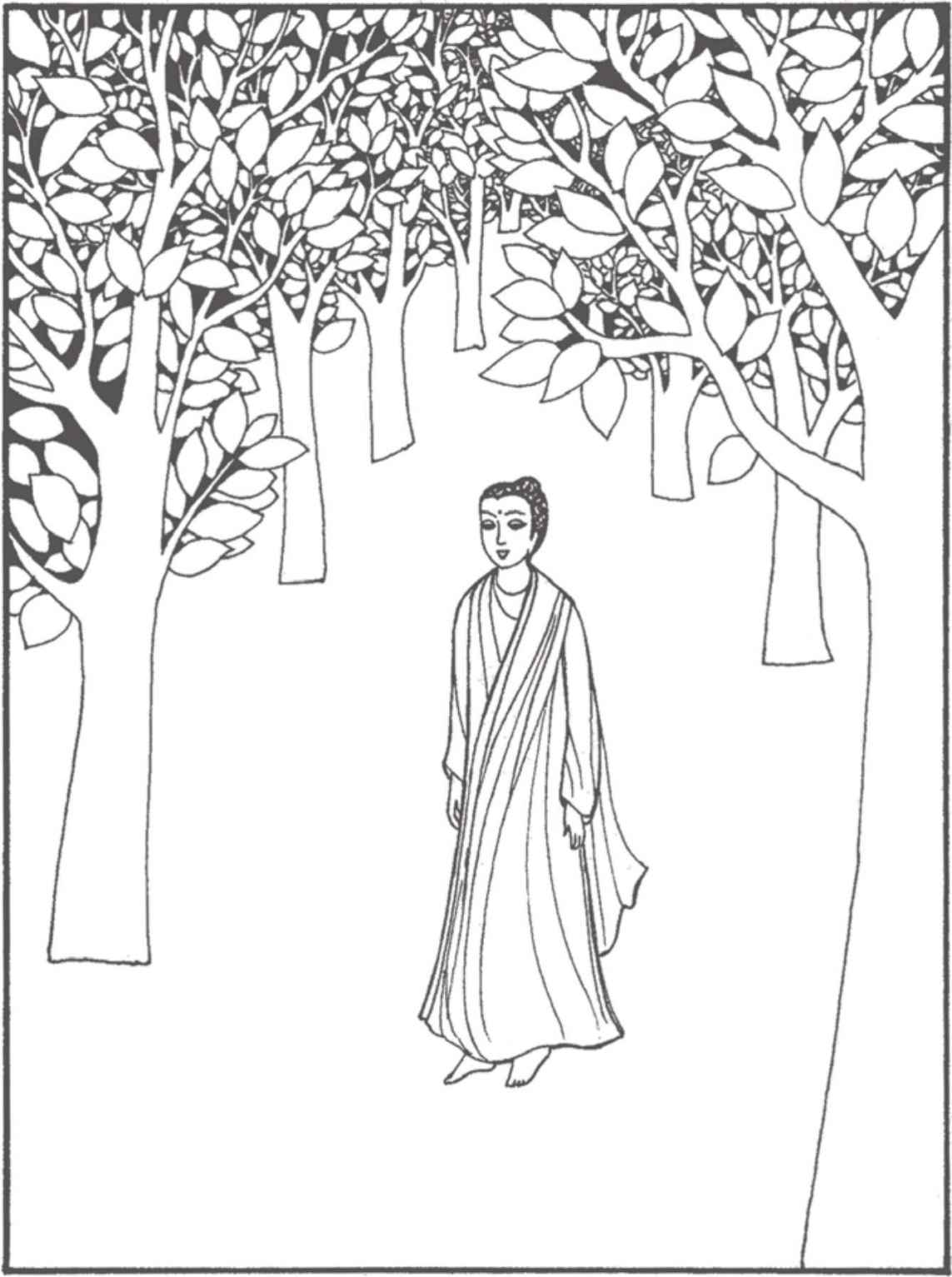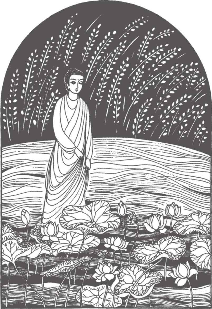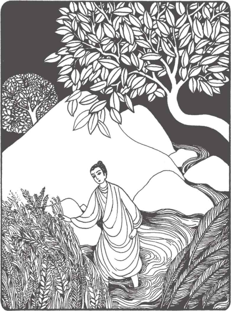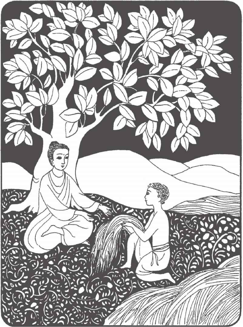 “你們長大了很多啊!”佛陀對他倆熱情地笑著說。縛悉底並沒有回答。看到佛陀那祥和的面孔,親切又毫不吝嗇的笑容,閃耀誘人的目光,縛悉底已被感動得熱淚盈眶,不知說什麼才好。佛陀穿著一件用很多碎布縫合成田狀圖案的衲衣。他依然是赤足而行,就像十年前在離這裡不遠的地方初次遇上縛悉底時一樣。那段日子裡,他們曾在河畔和菩提樹蔭下度過了很多時光。