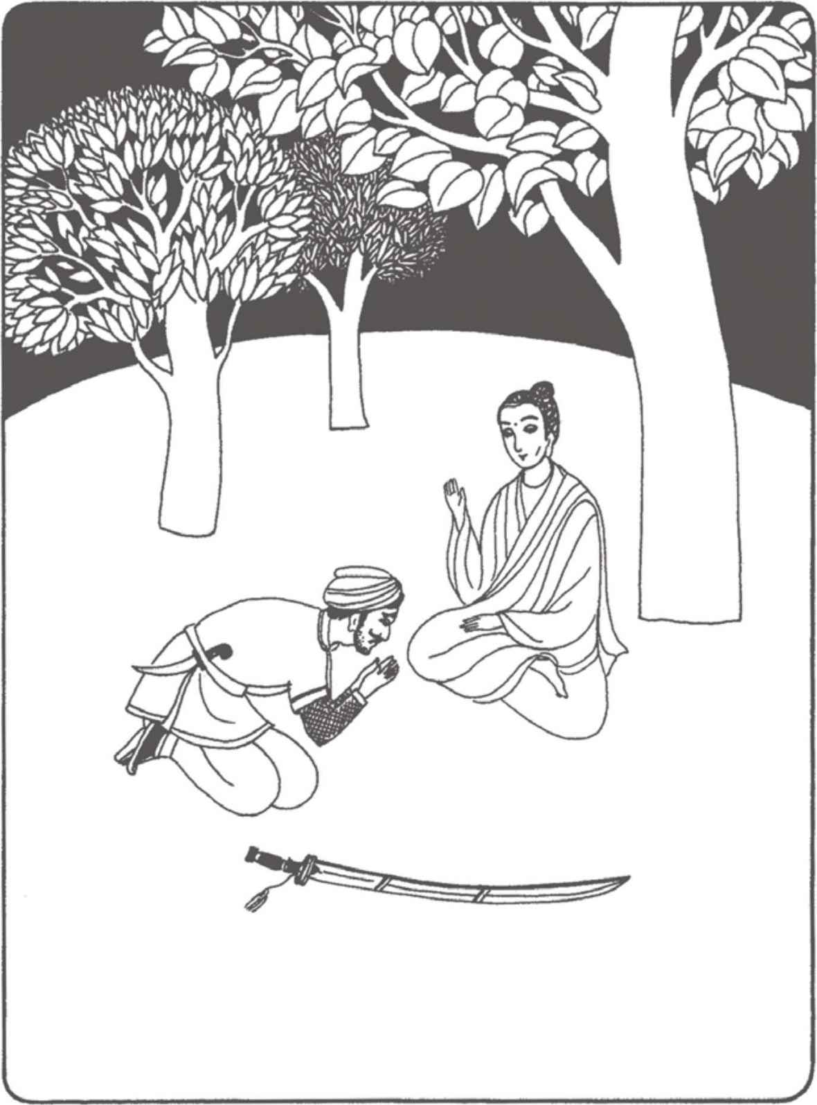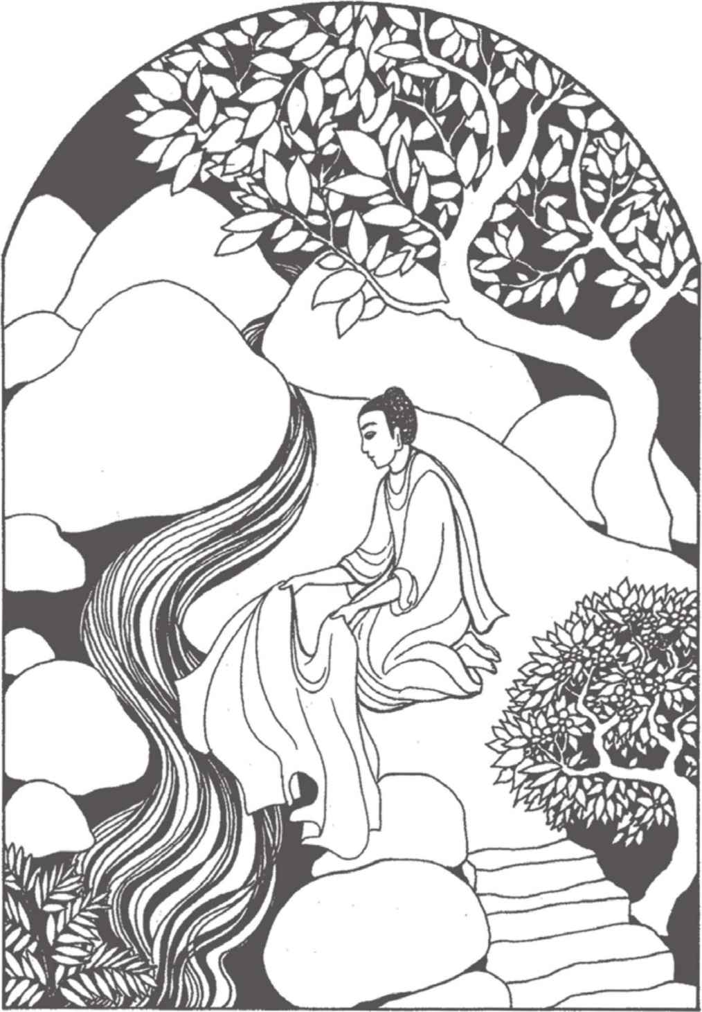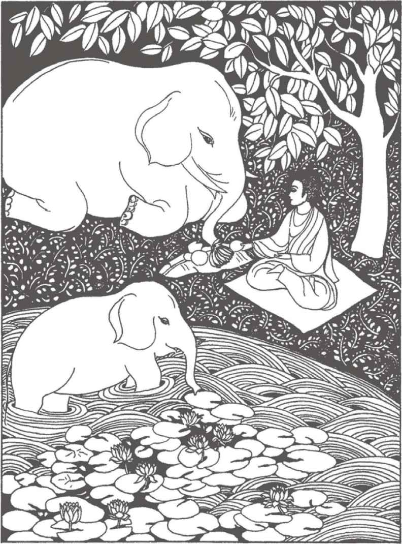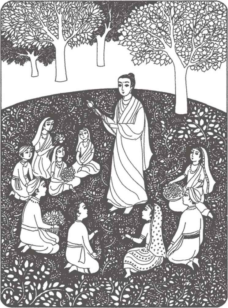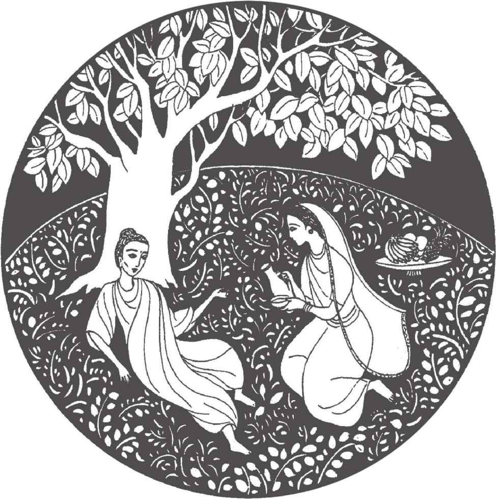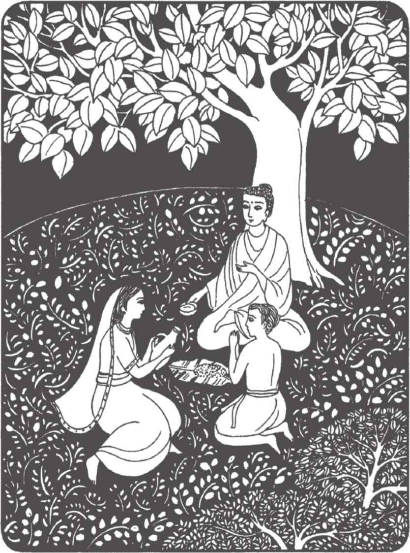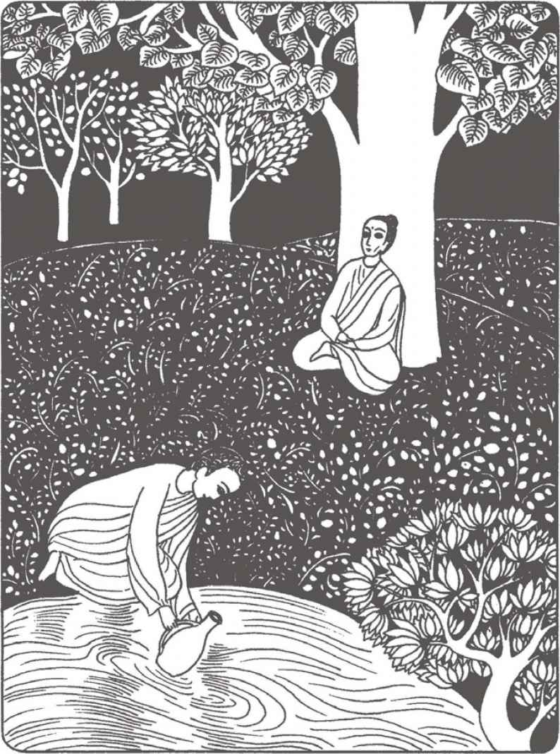 “你們長大了很多啊!”佛陀對他倆熱情地笑著說。縛悉底並沒有回答。看到佛陀那祥和的面孔,親切又毫不吝嗇的笑容,閃耀誘人的目光,縛悉底已被感動得熱淚盈眶,不知說什麼才好。佛陀穿著一件用很多碎布縫合成田狀圖案的衲衣。他依然是赤足而行,就像十年前在離這裡不遠的地方初次遇上縛悉底時一樣。那段日子裡,他們曾在河畔和菩提樹蔭下度過了很多時光。