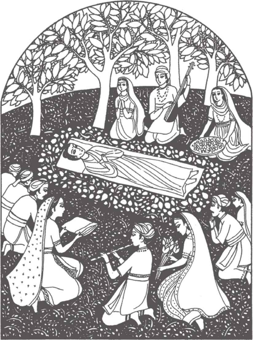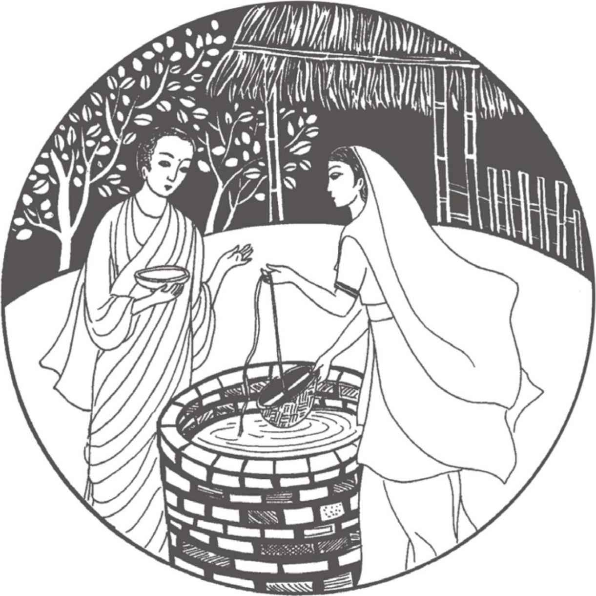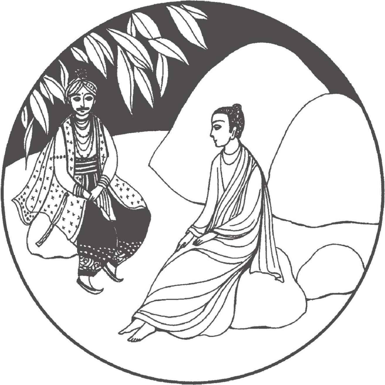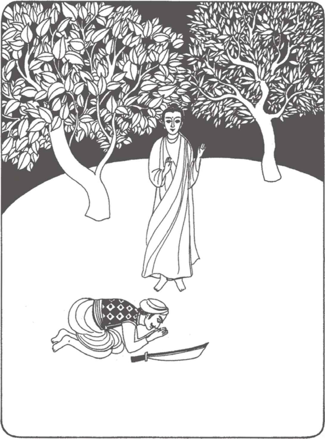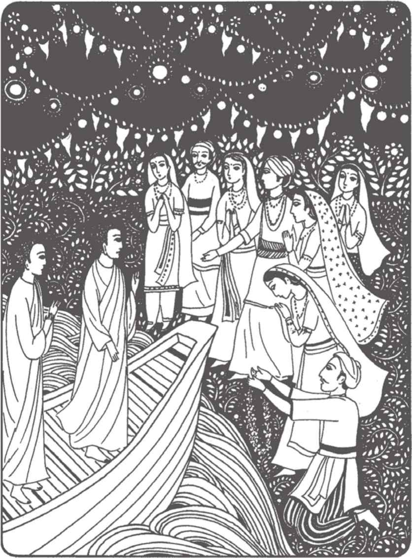 “你們長大了很多啊!”佛陀對他倆熱情地笑著說。縛悉底並沒有回答。看到佛陀那祥和的面孔,親切又毫不吝嗇的笑容,閃耀誘人的目光,縛悉底已被感動得熱淚盈眶,不知說什麼才好。佛陀穿著一件用很多碎布縫合成田狀圖案的衲衣。他依然是赤足而行,就像十年前在離這裡不遠的地方初次遇上縛悉底時一樣。那段日子裡,他們曾在河畔和菩提樹蔭下度過了很多時光。