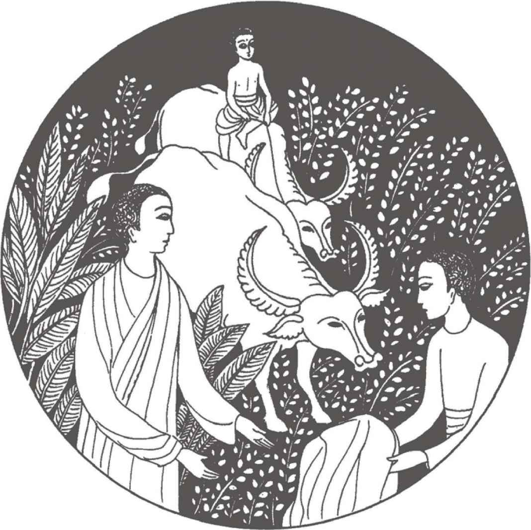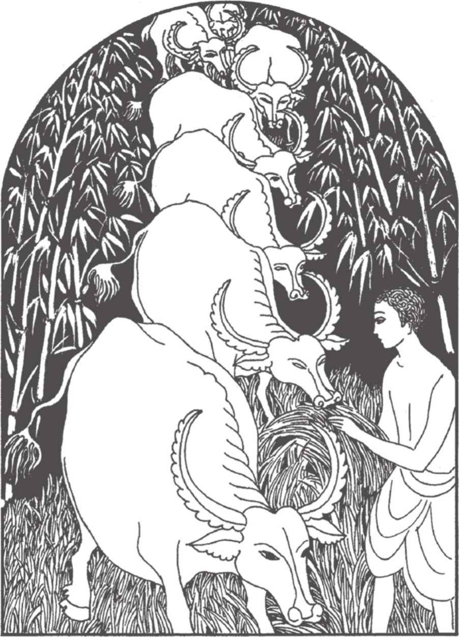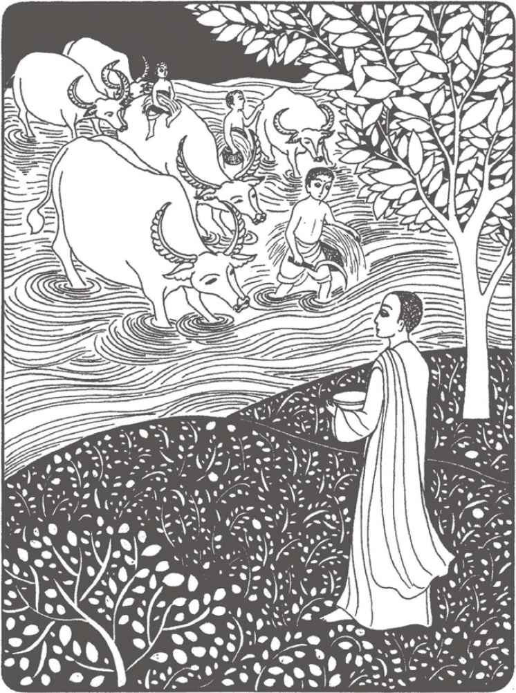 佛陀說話的時候,眼睛一直沒有離開過縛悉底。縛悉底也感覺到佛陀的話是對他而說的。他回想起多年前坐在佛陀旁邊時,佛陀曾叫他描述照顧水牛的工作細節。怪不得在宮中長大的王子也懂得關於水牛的一切了。