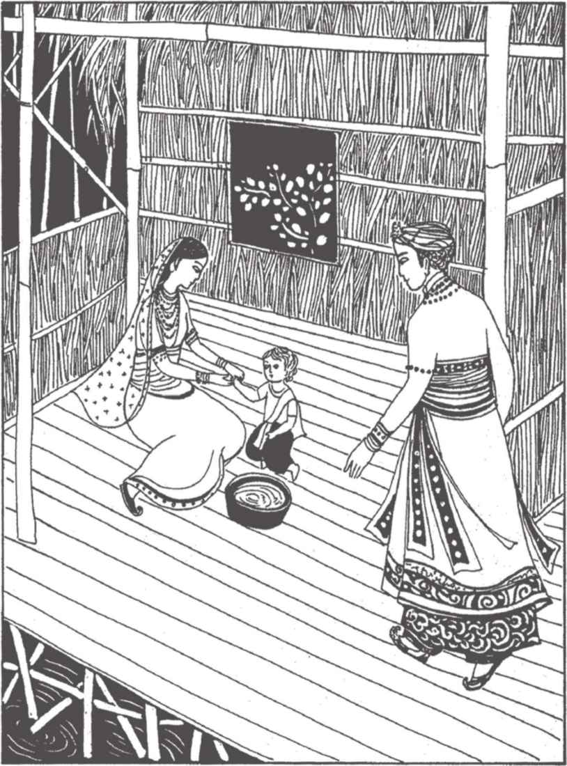 媲摩坐在盛放雨水的大木桶旁邊,望著她的姐姐,一言不發。縛悉底望望媲摩。她是一個非常可愛的女孩。縛悉底初遇佛陀的時候,芭娜只有六歲,盧培克三歲,媲摩則仍是個嬰孩。盧培克在門外玩泥沙時,芭娜就在給全家燒飯。