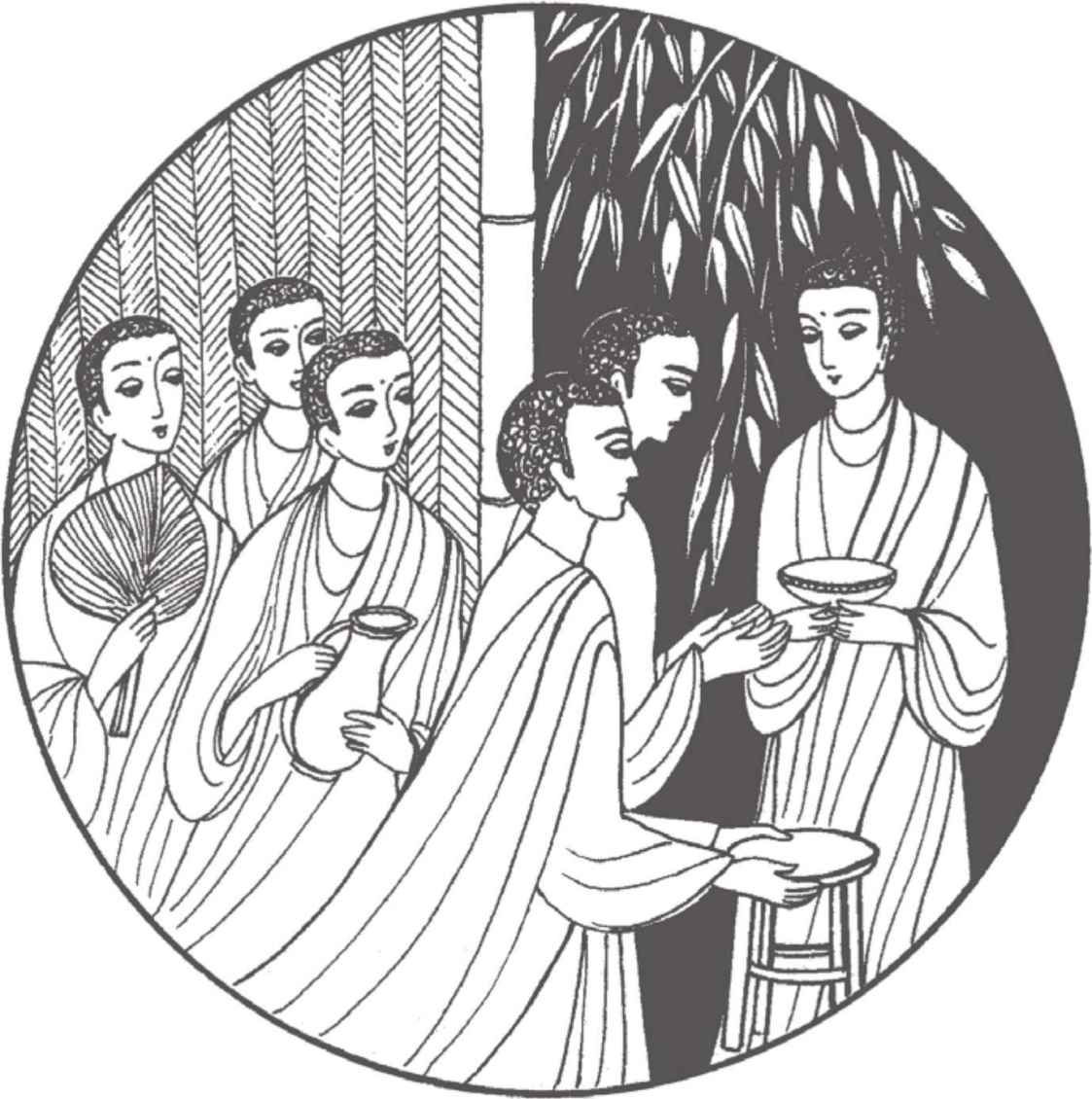 將近午間時分,縛悉底第一次正式以比丘的身份練習行乞。竹林精舍的全部比丘分成數個小隊,分別步往王舍城。縛悉底跟著舍利弗帶領的一隊。行出寺院不到數步,他就提醒自己,乞食也是修行的一種方法。他集中觀察著自己的呼吸,靜心留意前行的每一步。羅睺羅行在他的後面。雖然縛悉底現在已是一個比丘,但他很明白自己的經驗比羅睺羅少得多。他真誠堅決地發心要好好地栽培自己內在的謙卑和美德。