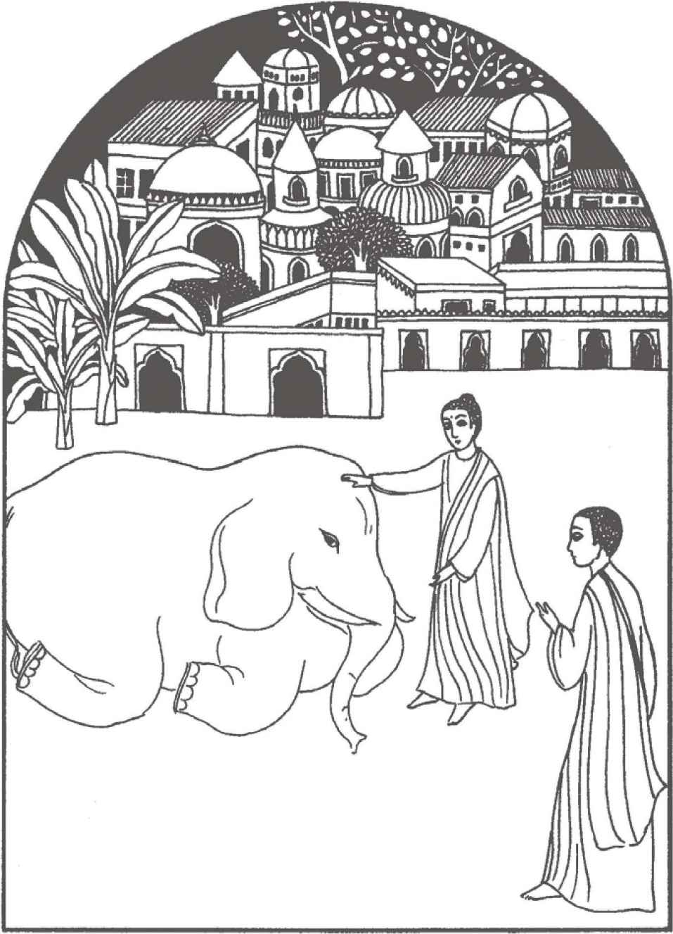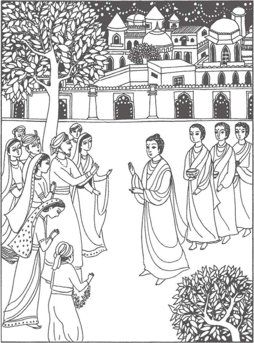就這樣日行夜息,他們終於行了十天才到達摩揭陀國的都城王舍城。這是縛悉底第一次見到城市。馬車在佈滿房舍的街道上疾馳而過。到處都回響著喧鬧和歡笑聲。但比丘們的行列,就如他們在河邊和田間行走時一樣,依然是那麼平靜地緩步而行。幾個城裡住的人停了下來看他們。又有幾個認得佛陀的,恭敬地作揖頂禮。比丘們繼續他們平和的行列,直至抵達位於城外的竹林精舍。
