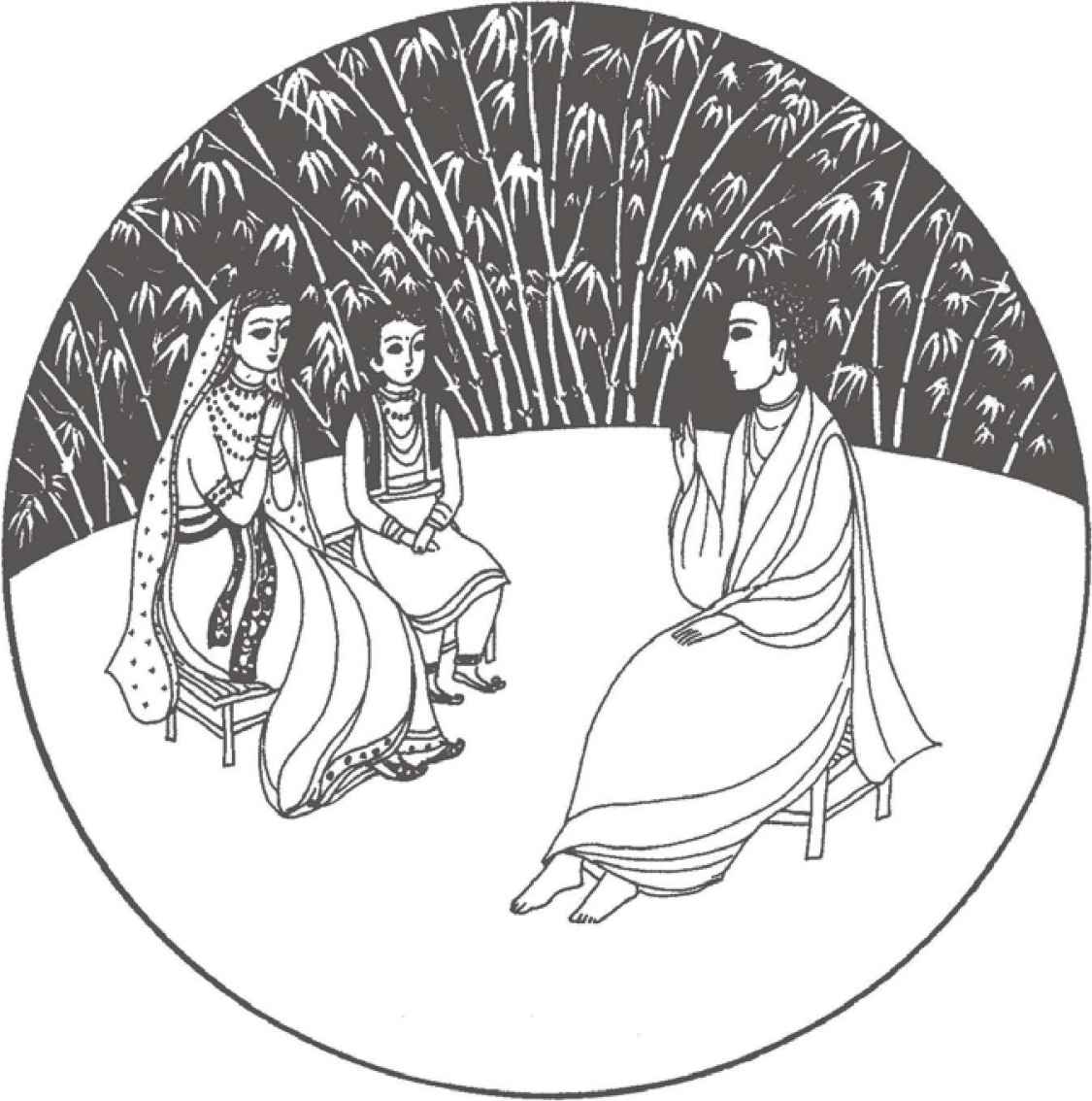 佛陀坐在竹臺上,高度剛好使每個人都可清楚地看到他。他安詳地端坐在那裡,威嚴的氣勢好比一頭獅王。望向眾人時,他的眼光充滿慈悲。當佛陀看見縛悉底和羅睺羅,他微笑著說: