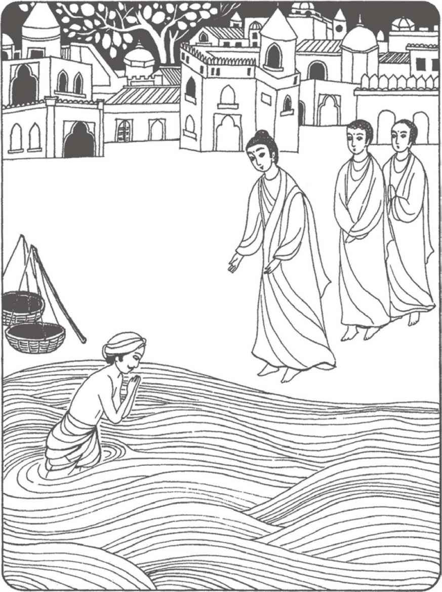 縛悉底望望跟隨著佛陀的二十位比丘,見他們個個都是赤著腳,穿著和佛陀一般顏色的衲衣。再看清楚一點,縛悉底才發覺佛陀的衲衣比其他比丘的長了一截,大約長一隻手掌的長度。站在佛陀旁邊的,是一個直望著他微笑而年紀又和他相若的沙彌。佛陀輕輕地在縛悉底和盧培克的頭上拍拍,然後告訴他們,他是在回王舍城的路途中,特地前來探訪他們的。他又表示很樂意等他們給水牛洗澡完畢後,和他們一起步行回到縛悉底的茅舍。