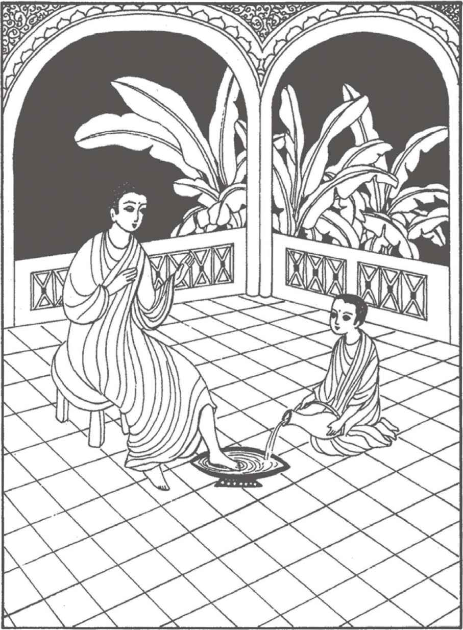 佛陀回來的消息很快傳遍寺院。不到幾分鐘,近四百個比丘已齊集歡迎他回來。佛陀沒有說太多,只是問問他們的近況和禪定的修習情形。他交託舍利弗照顧縛悉底,羅睺羅也是依止舍利弗的。舍利弗是寺院裡沙彌的主導師,負責看管超過五十個年輕的初學者。他們全部都是參加僧團未超過三年的。寺院的常住則是一個名叫憍陳如的比丘。