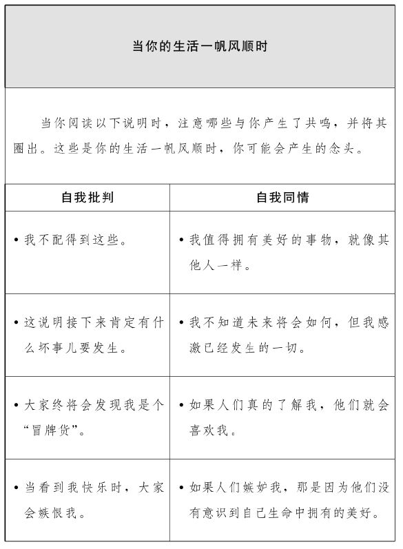 當你的生活一帆風順時,自我同情使你不會感到配不上這一切。我們知道,我們值得擁有生命中美好的事物——這並不是因為我們比其他人更好,而是因為這是人之常情。同情並不是某種需要我們苦苦索求的東西,而是我們作為芸芸眾生的一員,生活賦予我們與生俱來的禮物。