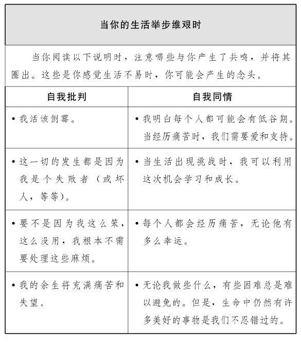 對自己和他人太過苛刻給我們帶來瞭如此多的痛苦,我們感到與他人隔絕,感到羞愧與孤獨。我們或許能夠數出幾件發生在自己身上特別糟糕的事情,又或許自打我們記事起,焦慮和沮喪就一直如影隨形。