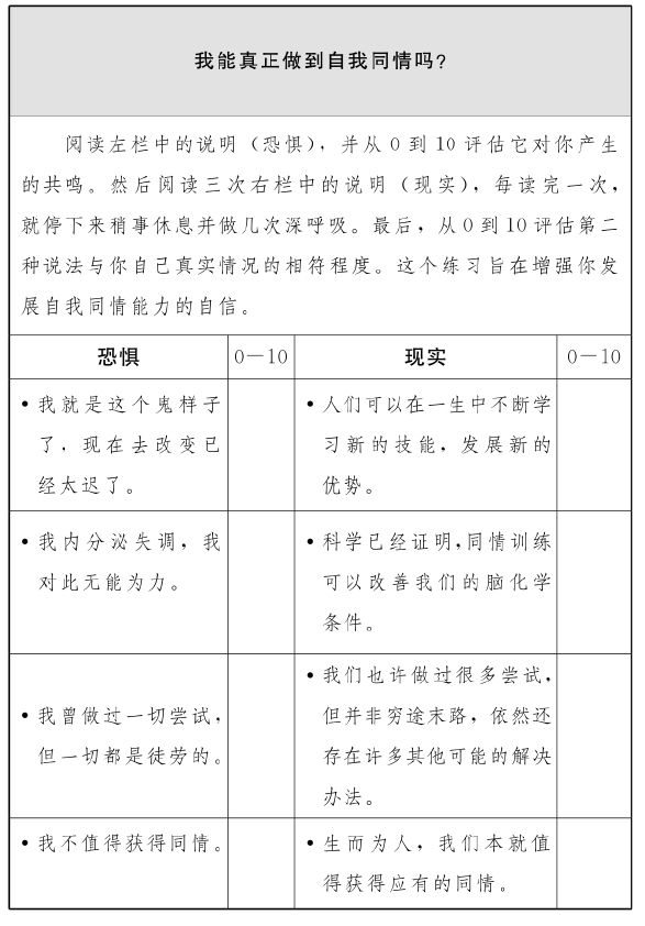 我的經歷使我瞭解到,真正內心的平靜與自由來源於:無論發生了什麼,我們都能夠去愛和接受自己。我同樣瞭解——從科學研究還有我自己的經驗來看——無論我能忍受多少痛苦和消極情緒,發展自我同情都是可行的。本書為你開始這一切提供了所有必需的敲門磚。