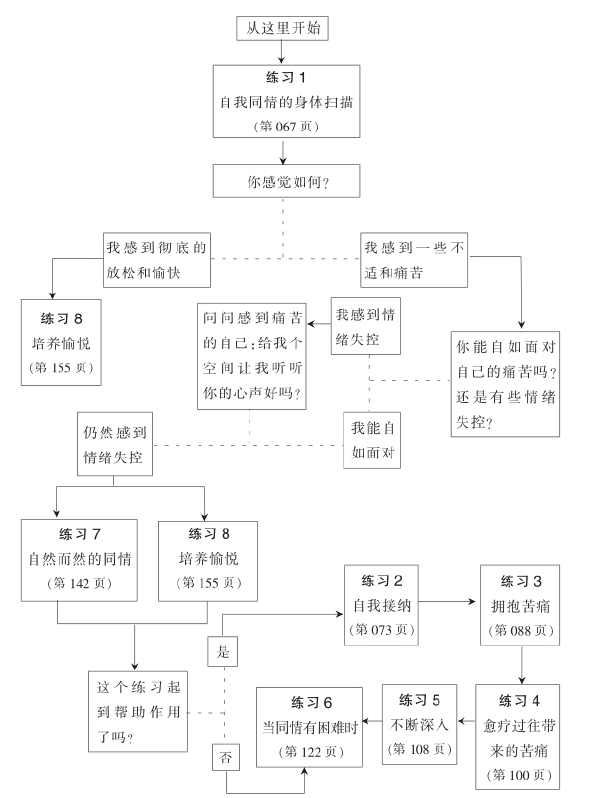 每個練習階段都由自我同情地圖進行引導,這將在第四章進行詳細解釋。你的每次練習都從地圖頂部開始,它將指導你進行最適合的練習——這取決於你當前的感覺和你對每一個練習的反應。