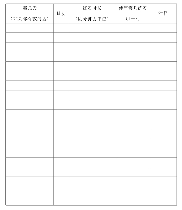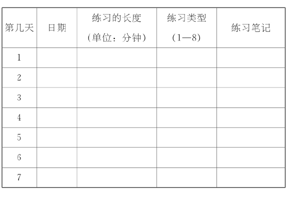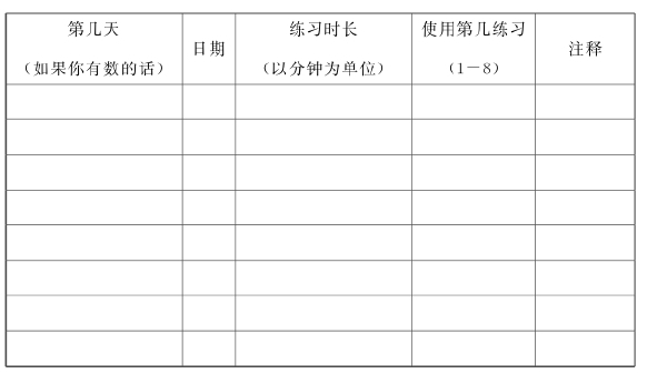 記住:你的每個練習階段都要從練習1開始。然後按照自我同情的地圖所示,找到最適合你的方法。使用這個日誌來記錄你練習的日期、練習的時長、你使用的練習以及你在練習過程中出現的想法。如果可能的話,試著每天留出30分鐘來進行練習。