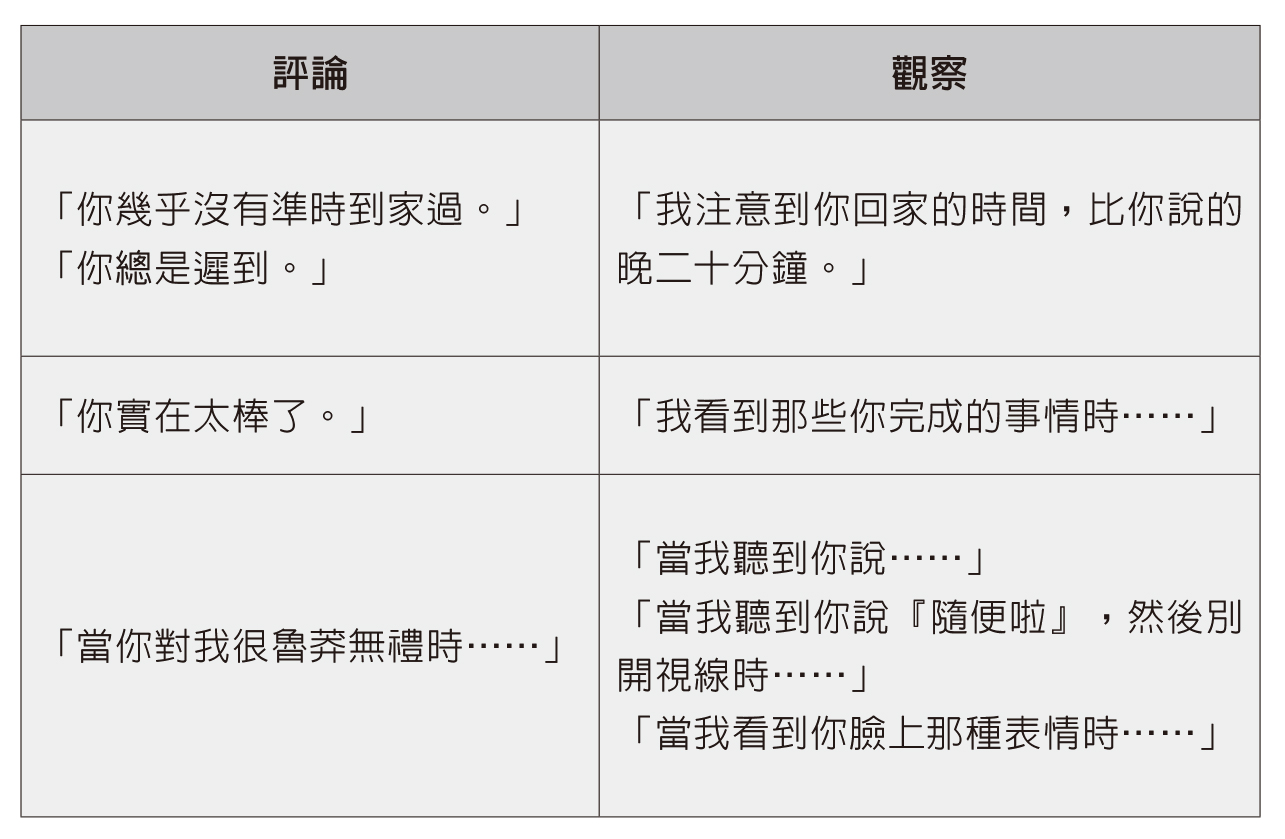「我真的很想聽聽你要說什麼,但你說話的方式讓情況變得很難繼續,不知道你願不願意……試著解釋一下你遭遇到什麼困難?/休息一下,直到我們都有辦法好好思考為止?/給我一點時間跟你說我到底發生了什麼事?」