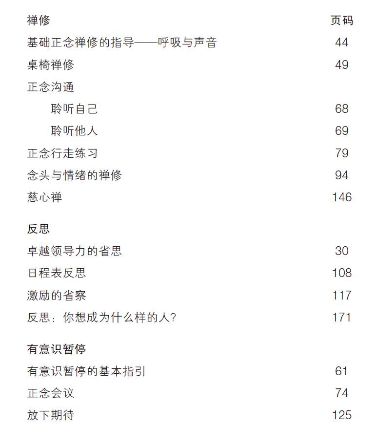 在這本《正念領導力:卓越領導者的內在修煉》中,除了一些基礎正念技法的傳授,還詳盡介紹了不少緊密結合領導者工作情境的練習,例如個人領導力原則的反思練習、有意識暫停與放下期待的練習、日程表靜思、反思你想成為什麼樣的人等,富於啟發,相當實用。